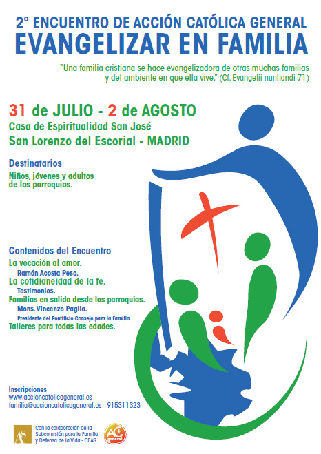 2º Encuentro de Acción Católica General. Evangelizar en familia. Del 31 de JULIO al 2 de AGOSTO, Casa de Espiritualidad San José. San Lorenzo del Escorial - MADRID. Para niños, jóvenes y adultos de las parroquias. Con la colaboración de la Subcomisión para la Familia y Defensa de la Vida - CEAS